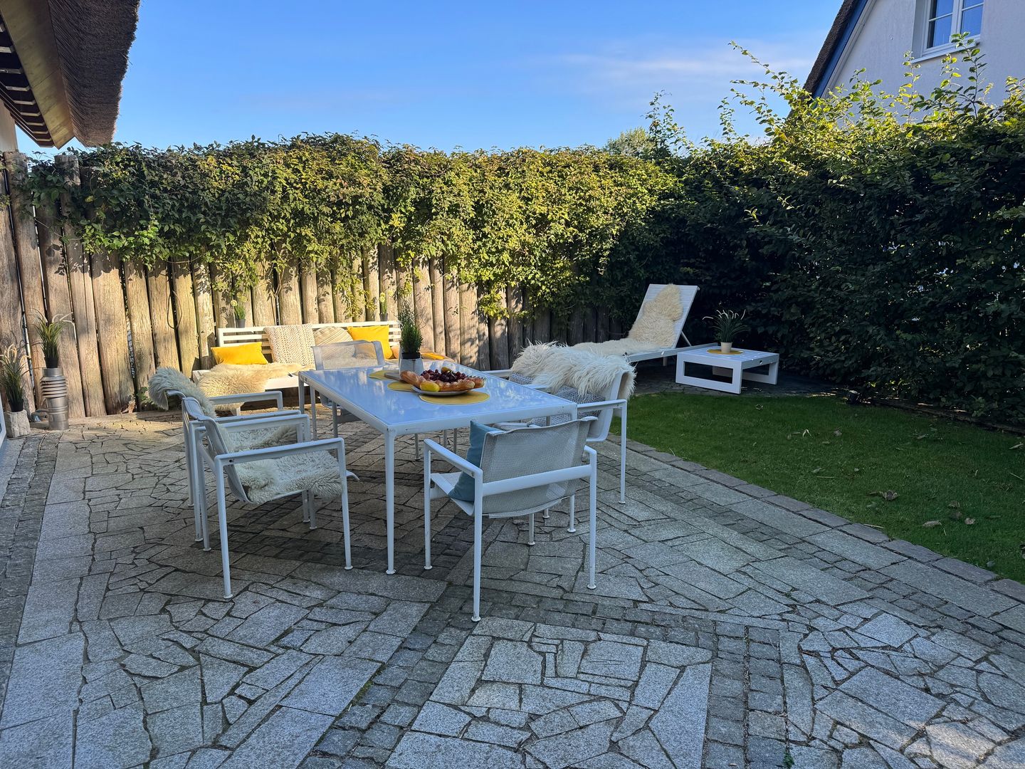Die offene Küche ist voll ausgestattet und ideal für alle, die gerne selbst kochen. Vom Geschirrspüler bis zur Kaffeemaschine ist alles vorhanden, damit Sie sich wie zu Hause fühlen können. Der angrenzende Essbereich bietet ausreichend Platz für gemeinsame Mahlzeiten in geselliger Runde. Über große Fenster strömt Tageslicht herein, und der direkte Zugang zur Terrasse mit Gartenmöbeln ermöglicht es Ihnen, die frische Ostseeluft zu genießen.