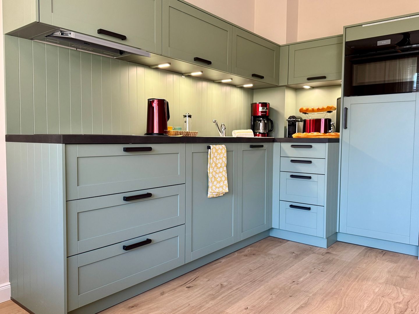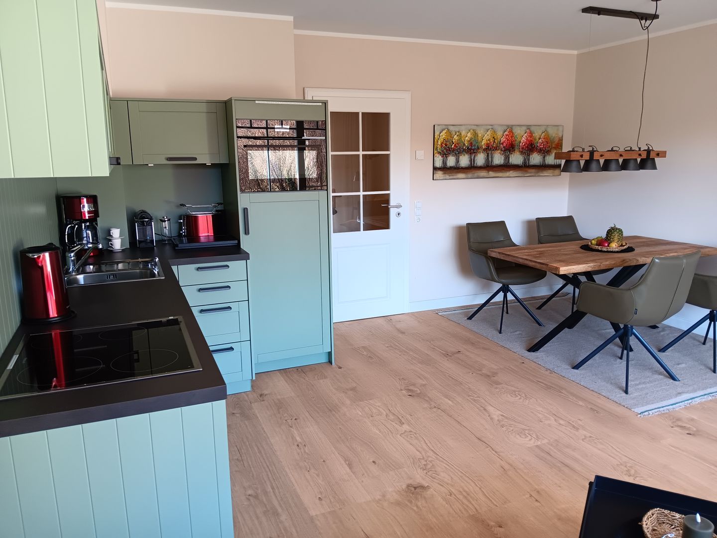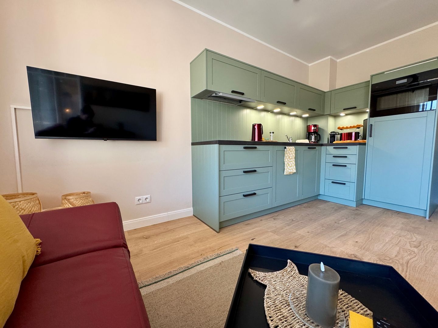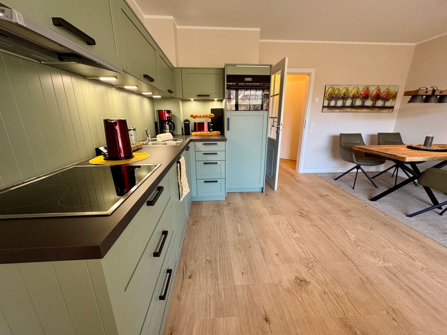 Die offene Küche ist perfekt in den Wohnraum integriert und bietet alles, was Sie für genussvolle Urlaubstage brauchen. Hier können Sie den Tag mit frischem Kaffee beginnen oder nach einem langen Strandspaziergang gemeinsam kochen und den Abend in entspannter Atmosphäre ausklingen lassen.