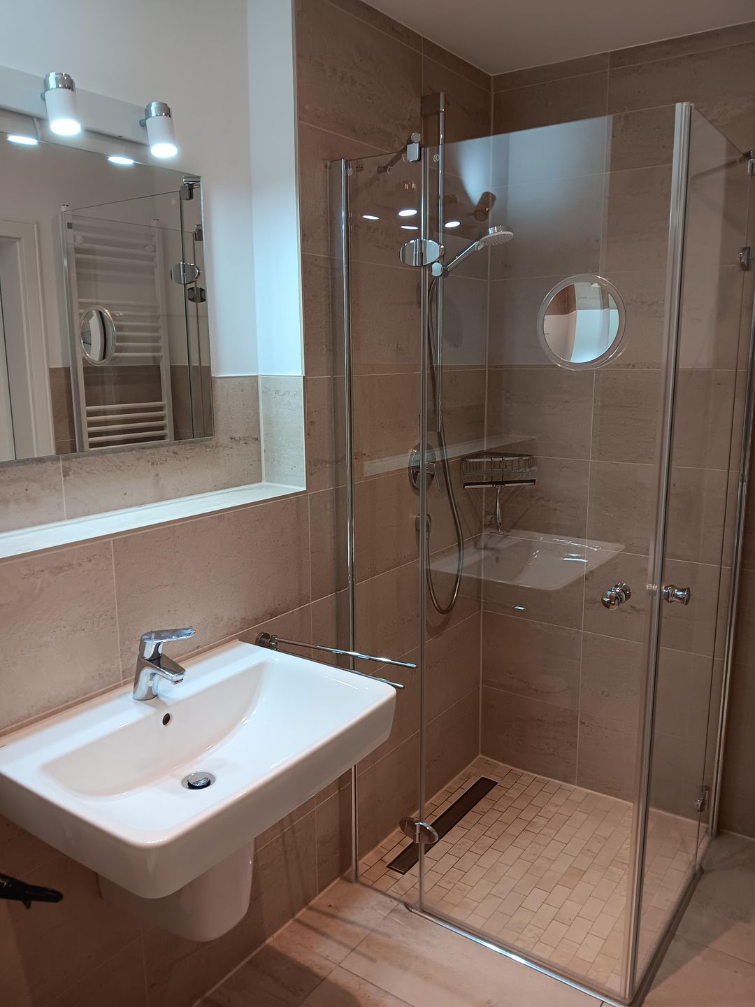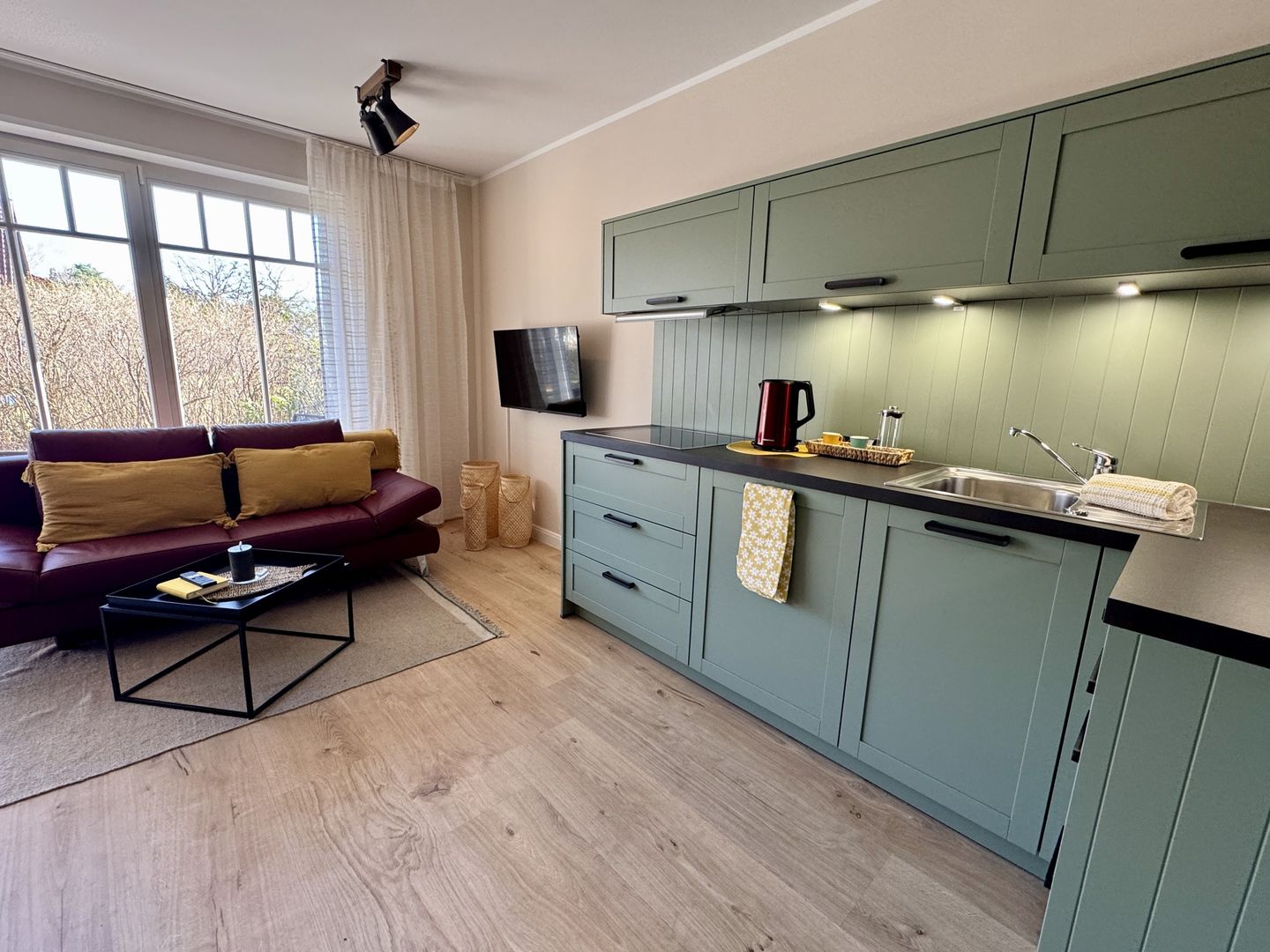 Schon beim Betreten spürt man die angenehme Ruhe des Apartments. Der Wohnbereich lädt mit einer gemütlichen Sofaecke und einem einladenden Essplatz zu entspannten Stunden ein – sei es bei einem guten Film, einem Glas Wein am Abend oder einem gemeinsamen Frühstück am Morgen. Große Fenster lassen viel Licht herein und schaffen eine freundliche, offene Stimmung. Fliegengitter und Sichtschutz sorgen dabei für Komfort und Privatsphäre, während die Fußbodenheizung zu jeder Jahreszeit eine behagliche Wärme schenkt.