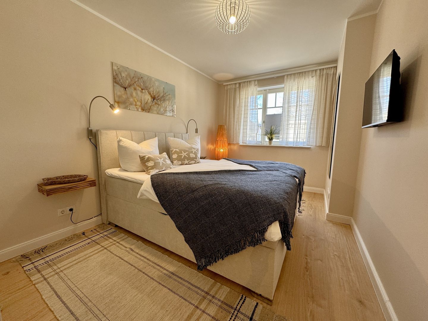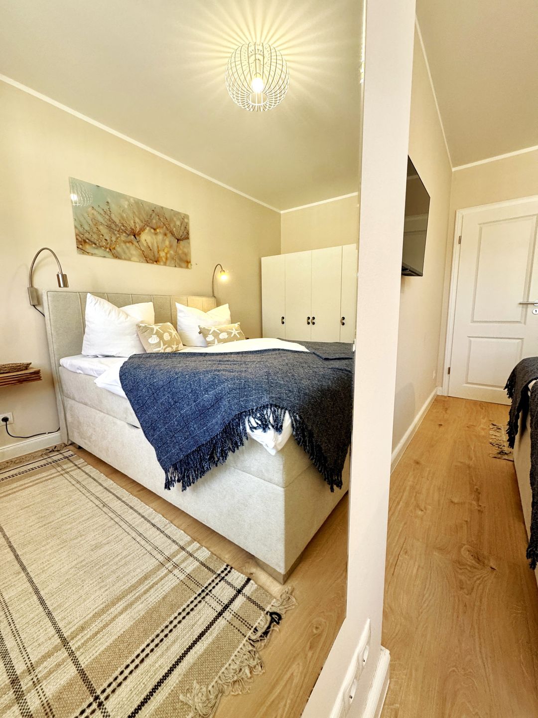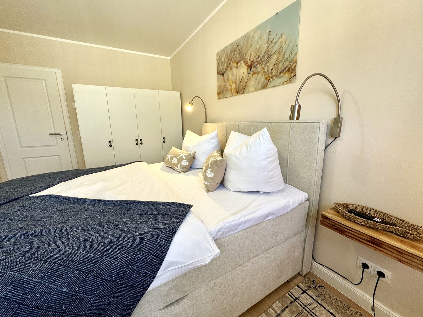 Das Schlafzimmer verspricht mit seinem modernen Boxspringbett erholsame Nächte und ruhige Morgen. Das moderne Badezimmer mit bodengleicher Dusche und Waschmaschine rundet den Komfort ab und macht auch längere Aufenthalte besonders angenehm.