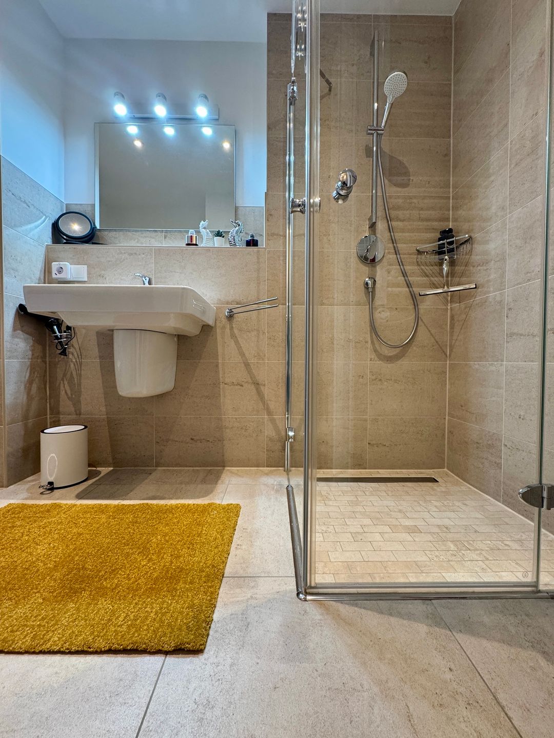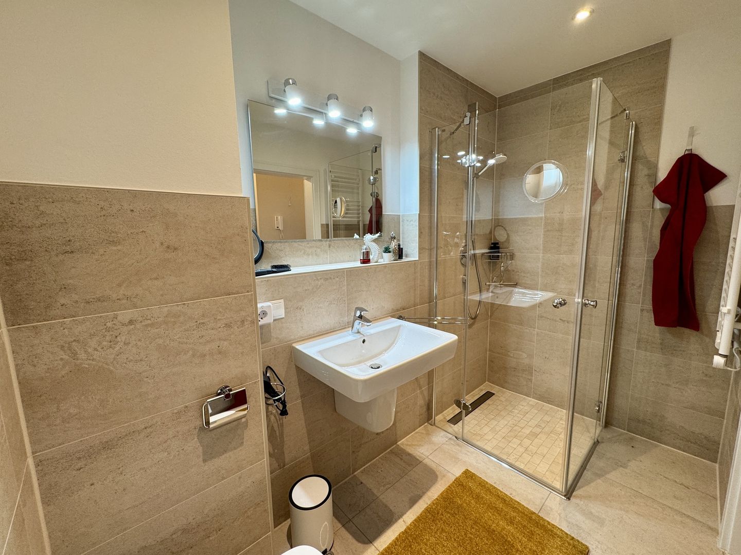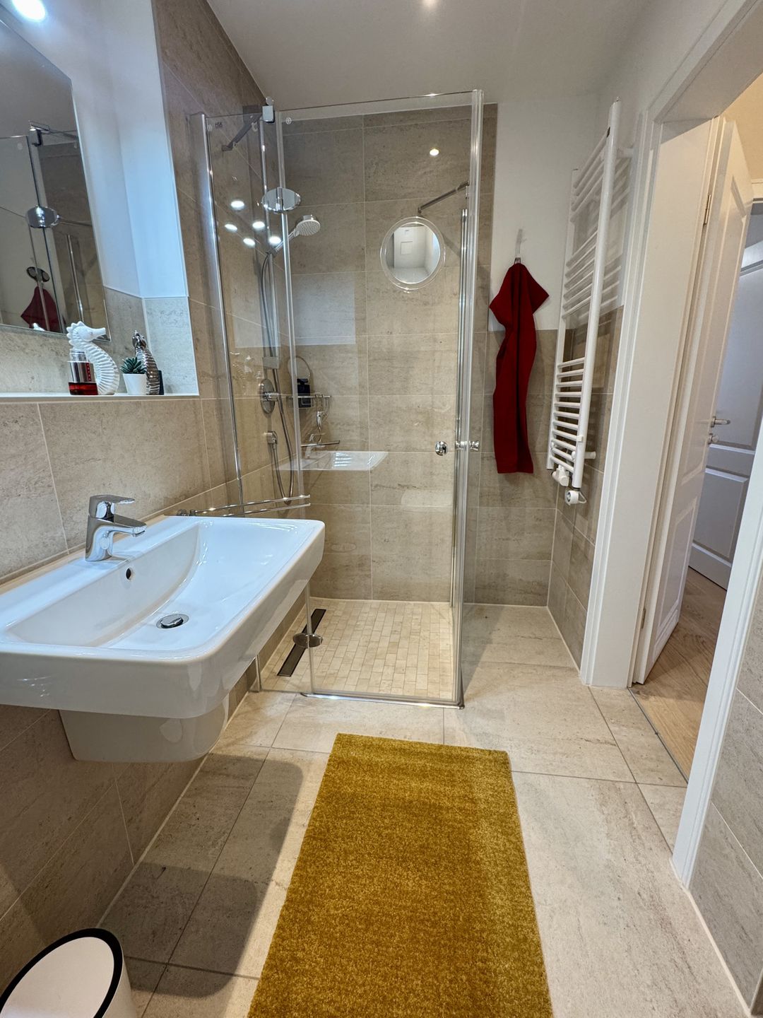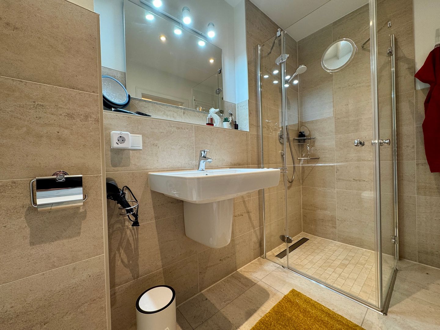 Das Schlafzimmer verspricht mit seinem modernen Boxspringbett erholsame Nächte und ruhige Morgen. Das moderne Badezimmer mit bodengleicher Dusche und Waschmaschine rundet den Komfort ab und macht auch längere Aufenthalte besonders angenehm.